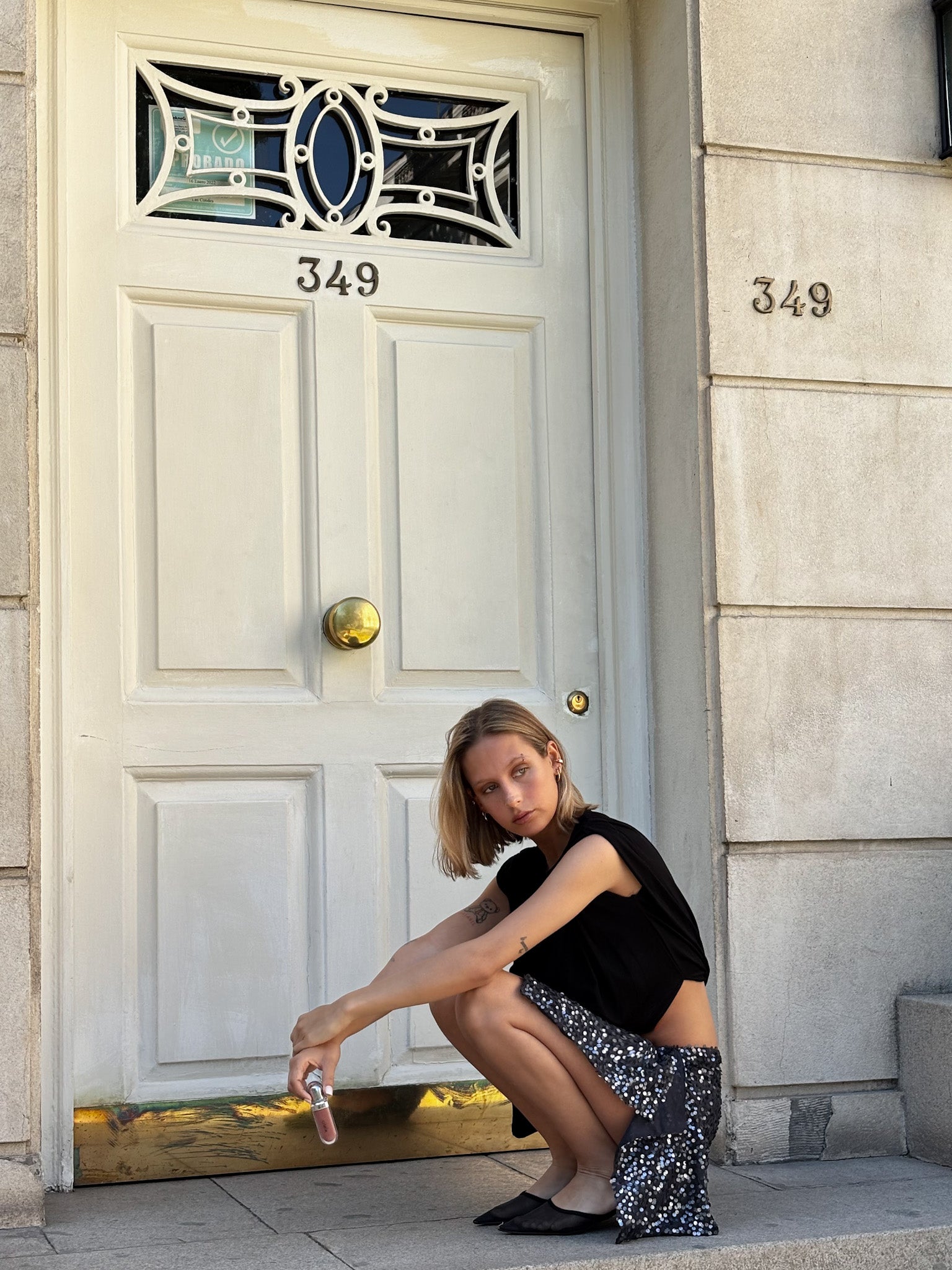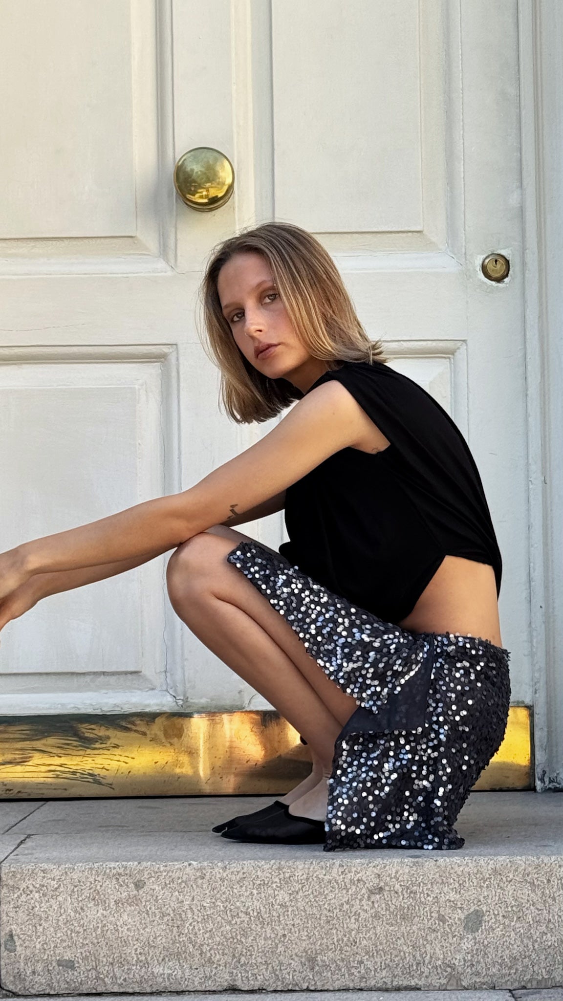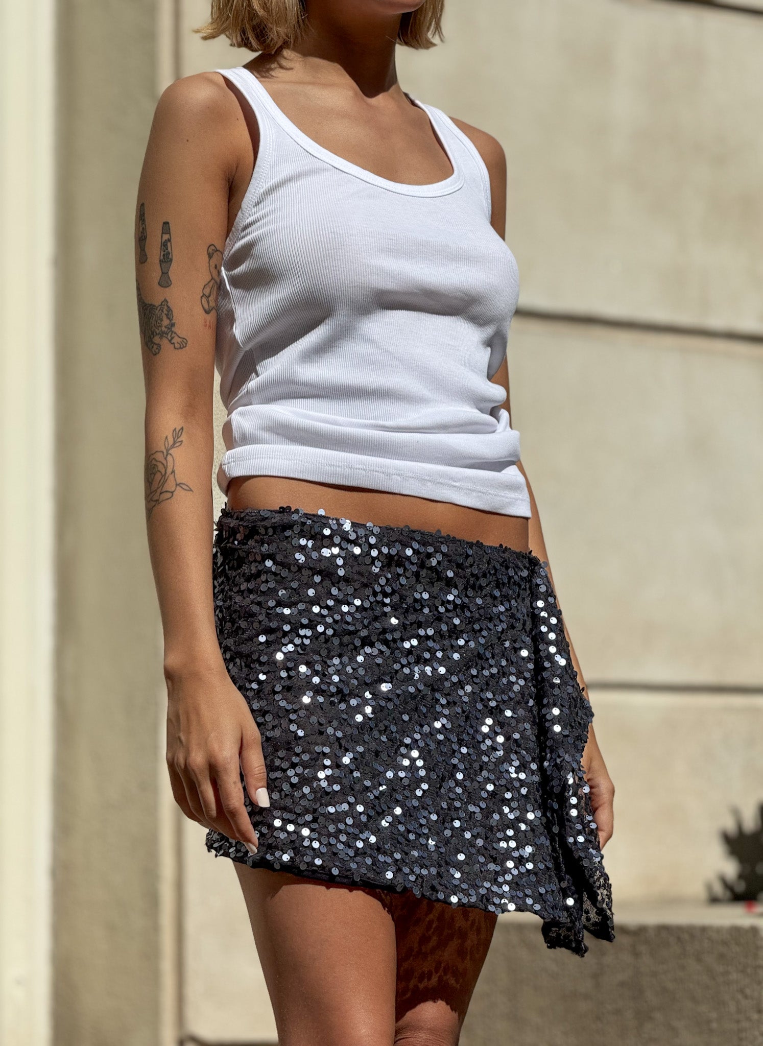 Una falda diseñada con lentejuelas bordadas en un gris azulino que crean un contraste audaz. Perfecta para agregar estilo y confianza a tu look de noche.
